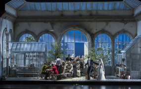 The production itself is interesting, the concept of full house on 2 levels and interchanging locations is relevant and attractive, providing opportunity to go for parallel activities thus fully utilising potential opportunities of the smart set. The set construction added cinematographic flavour to the production, and probably many details can be noticed on second viewing. Regardless of very high viewpoint from the top of the house – sitting on the last row of Rang 2 of Haus für Mozart, it was possible to see all activities of the cast.