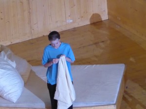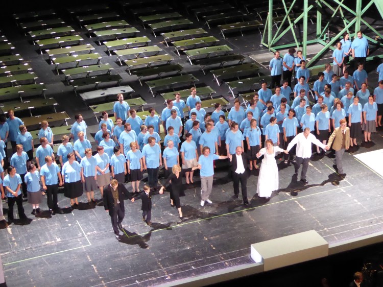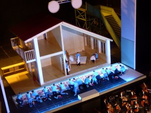 The staging and costumes by Ultz support overall idea of Richard Jones of architecting and building (and destroying) our lives. It is not a miracle, it is knowledge, skill and hard work. The metaphor used by the director is played throughout the performance and is fortified by appropriate costumes of the cast – Elsa wearing overalls together with other people, Lohengrin in blue t-shirt, in contrast with royal court Brabantians. The house built together by Elsa and Lohengrin is burned down by him in the last act before releasing his identity and ruining the dream future.
