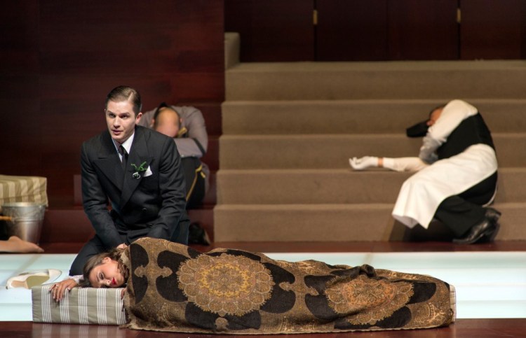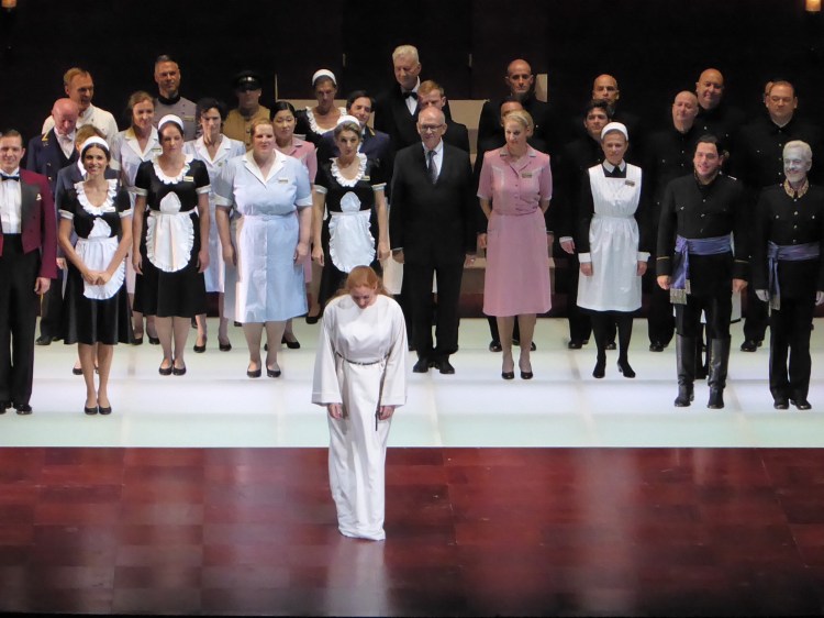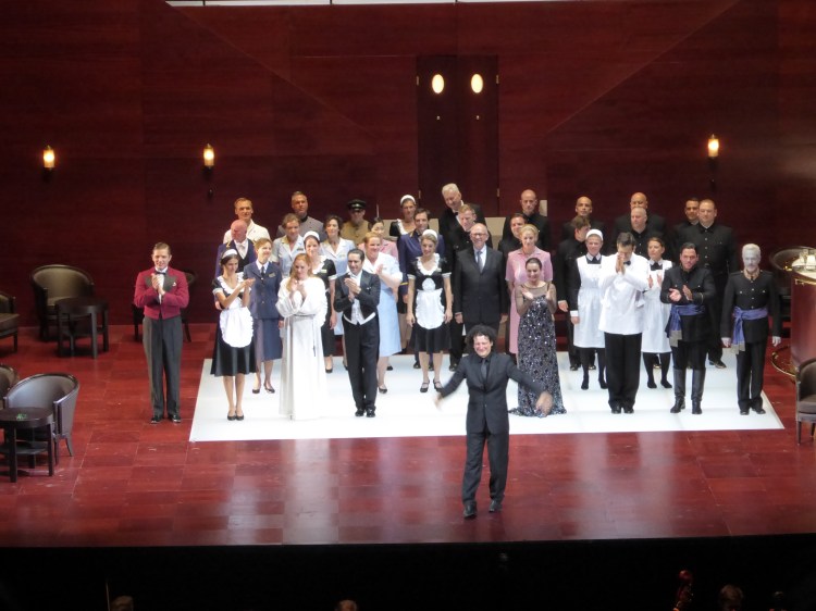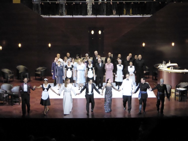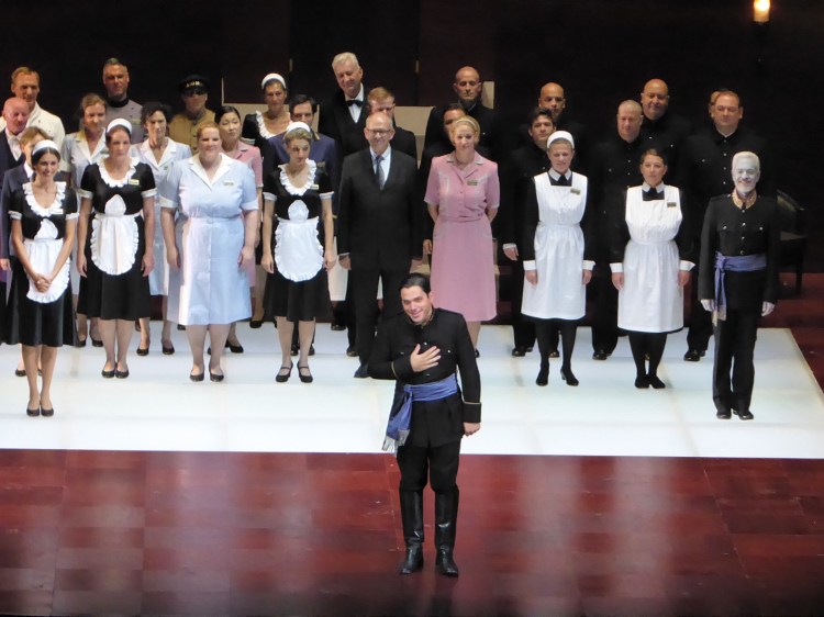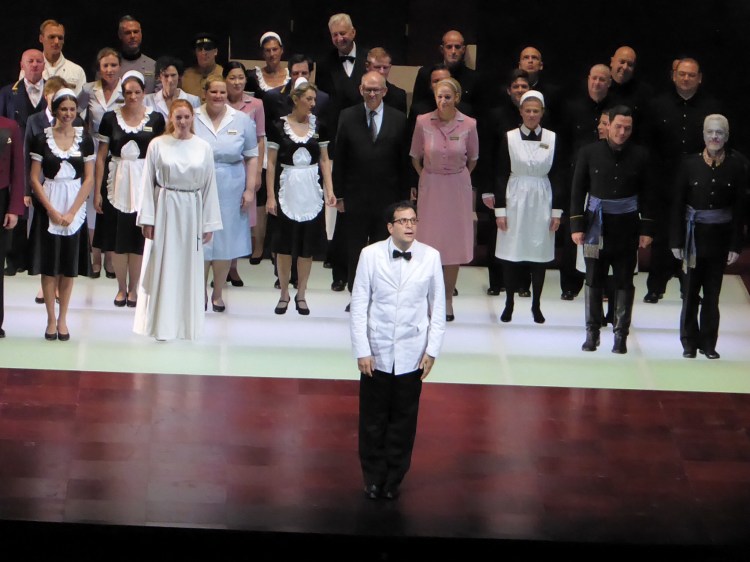The production by Sven-Eric Bechtolf features the same hotel lobby which serves well as basis for all turns of libretto and provides a lot of opportunity to move around and introduce new props when needed. There is action in abundance, and it is obvious that all movements have been well through through and rehearsed, thus nothing is left to chance. The director’s hand has been supportive and it is obvious that each sequence has proper justification and is glued well into overall canvas of the performance. The style and “handwriting” has noticable similarities with Cosi and Le Nozze of last year.