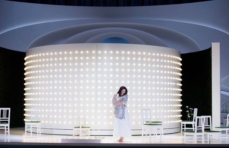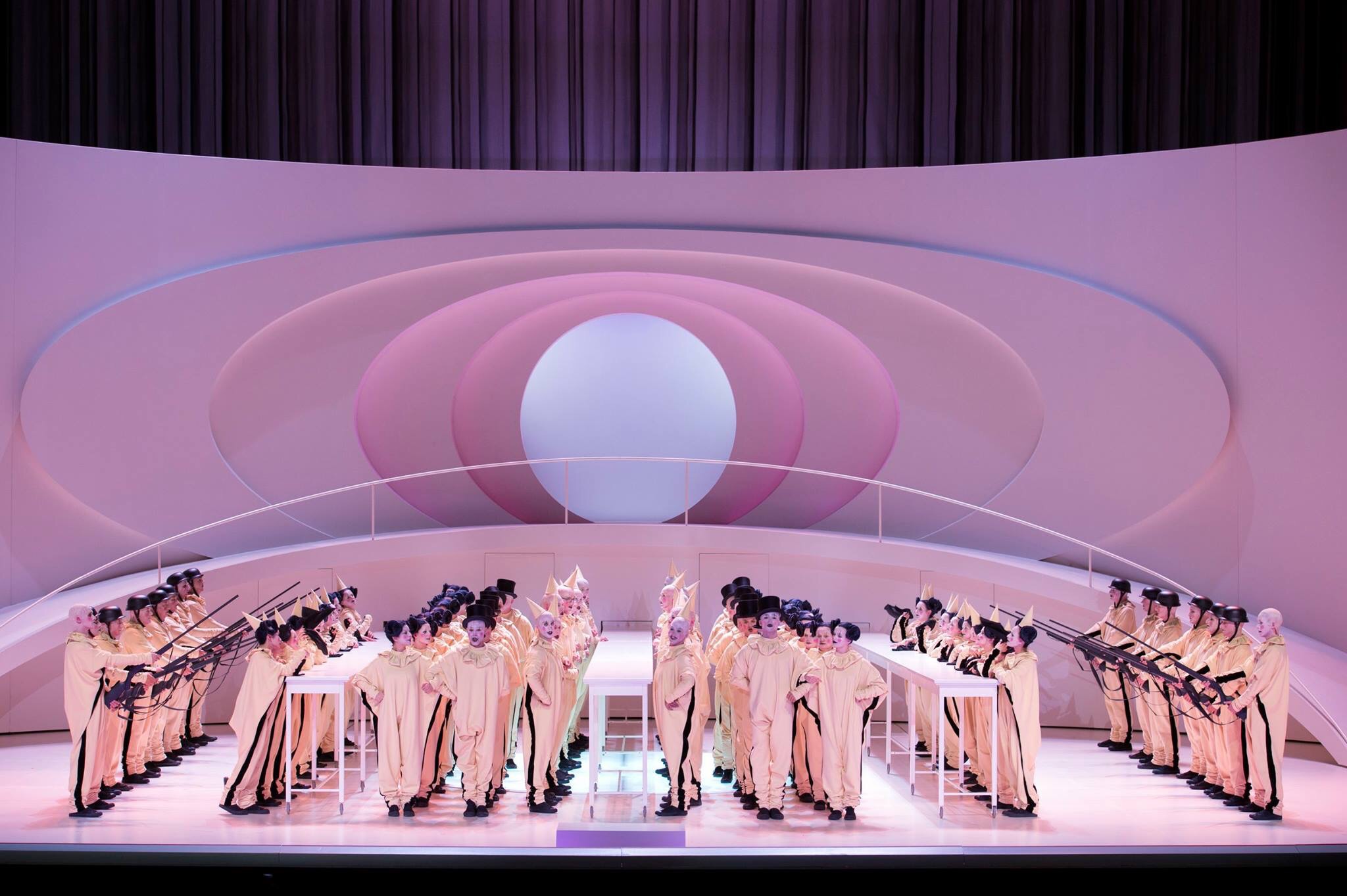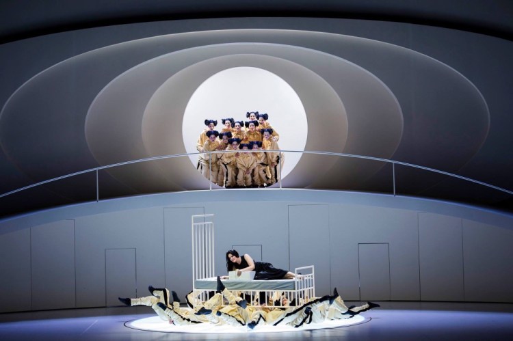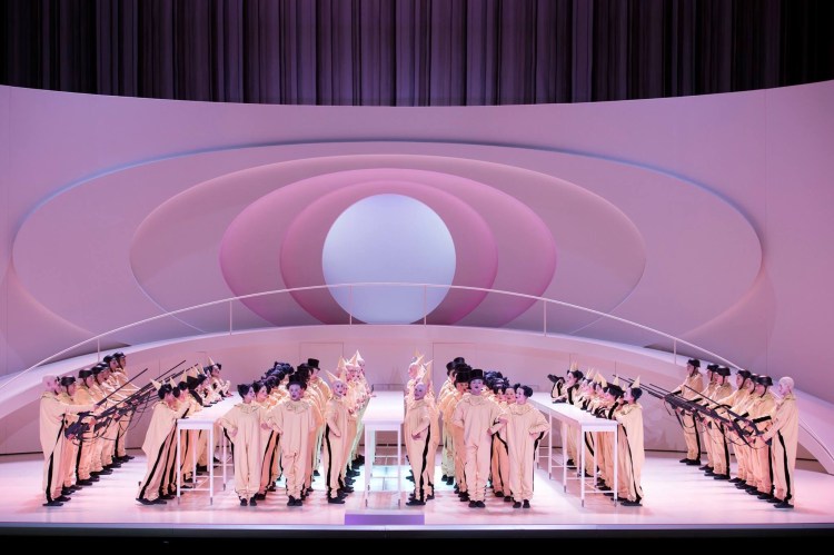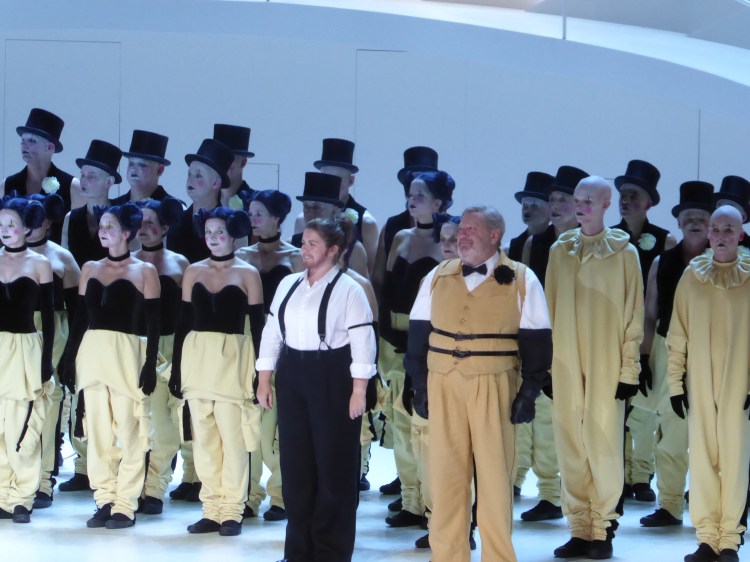 Staging and director intent of Reinhard von der Thannen becomes better understandable only after concept remarks are read in the program book – the optical lens as stage concept is difficult to read without an extra hint. Some elements in the set design are not clear; as an example: question arises why descending skeleton was needed, it had more sarcastic rather than conceptual use. Church organ pipes like spears descending from the heaven is an interesting element used smartly in the context of the scene. Dancers were a proper addition to the chorus, as their moves were supporting stage action and complementing the story.