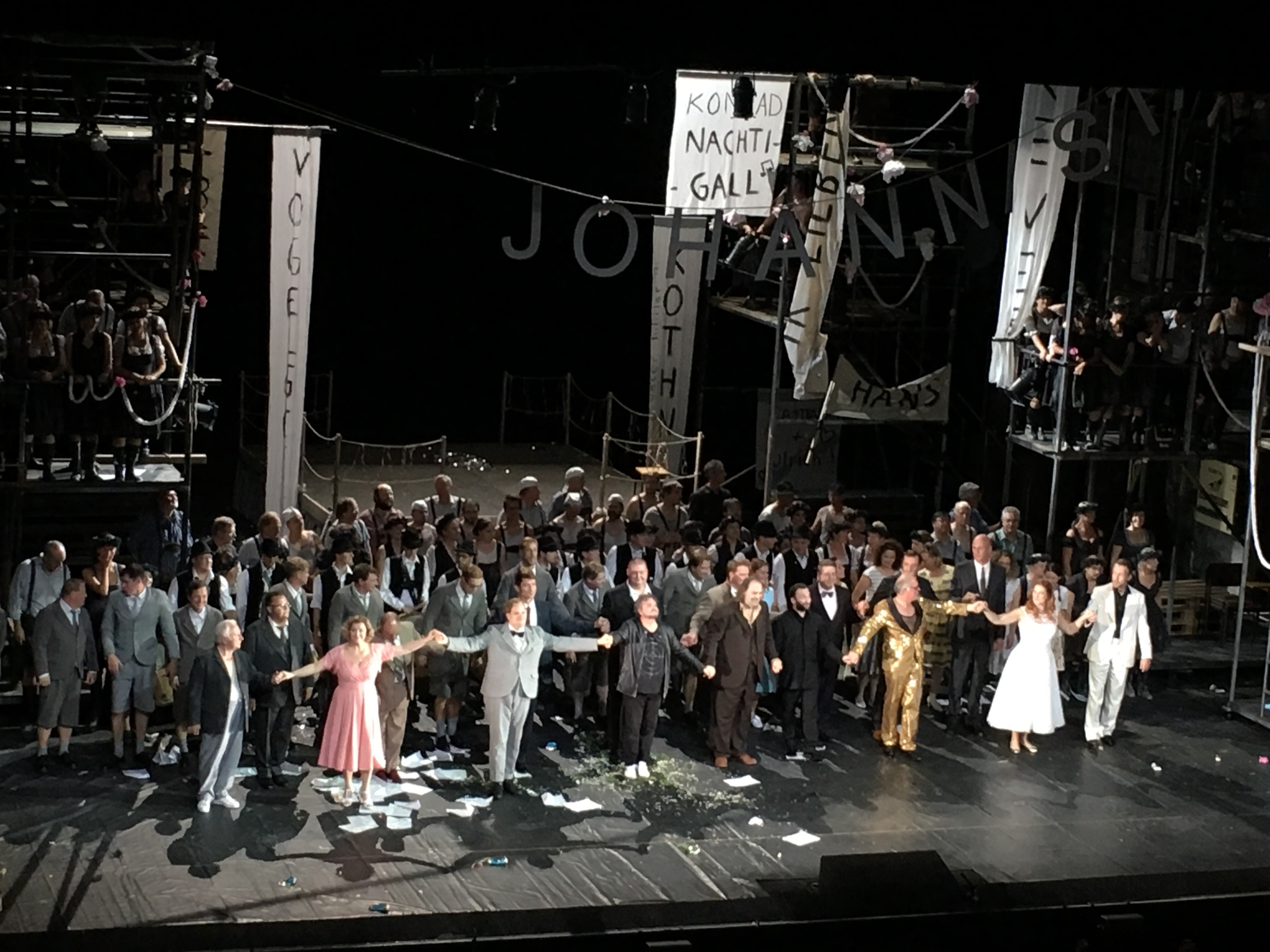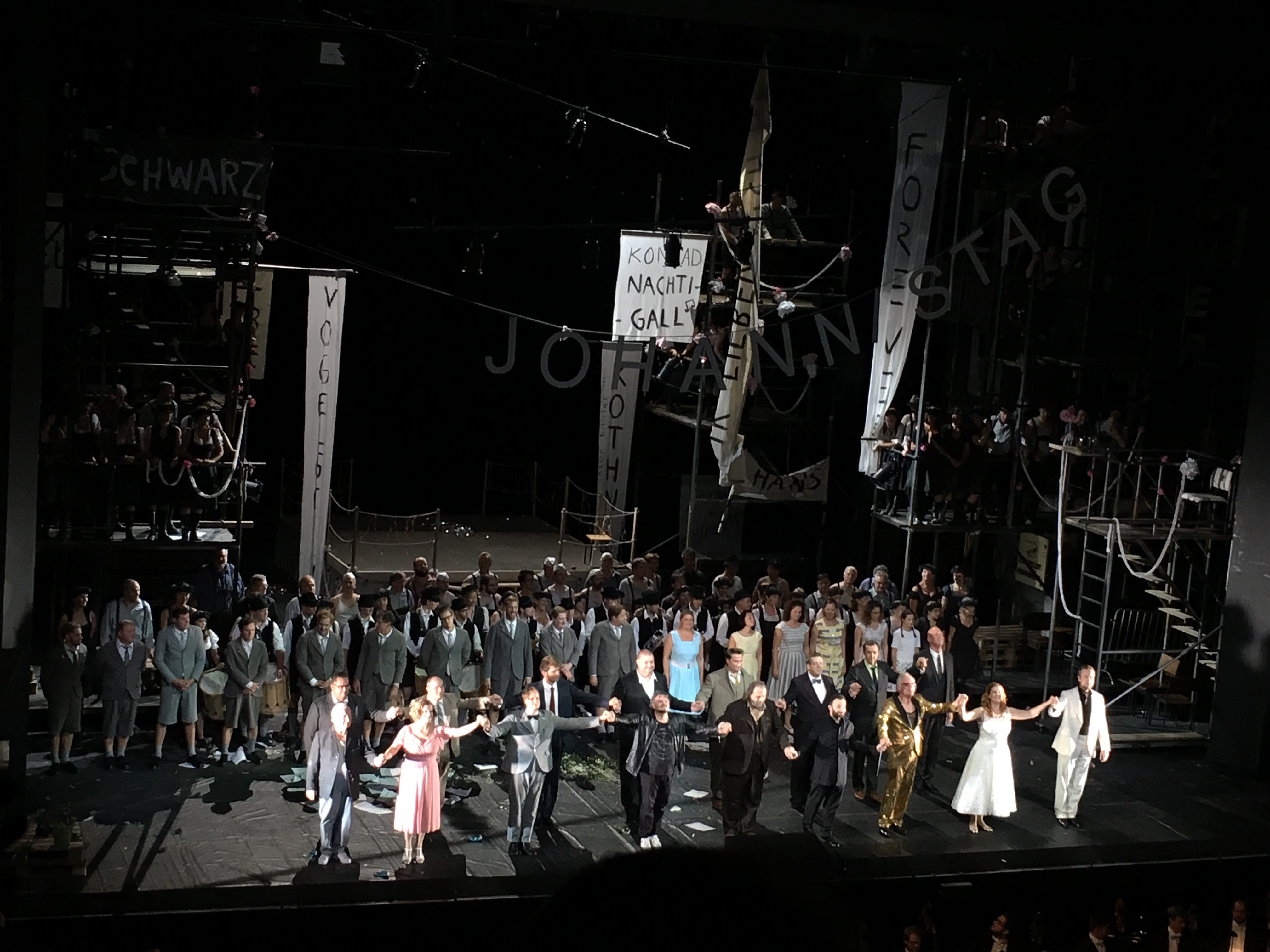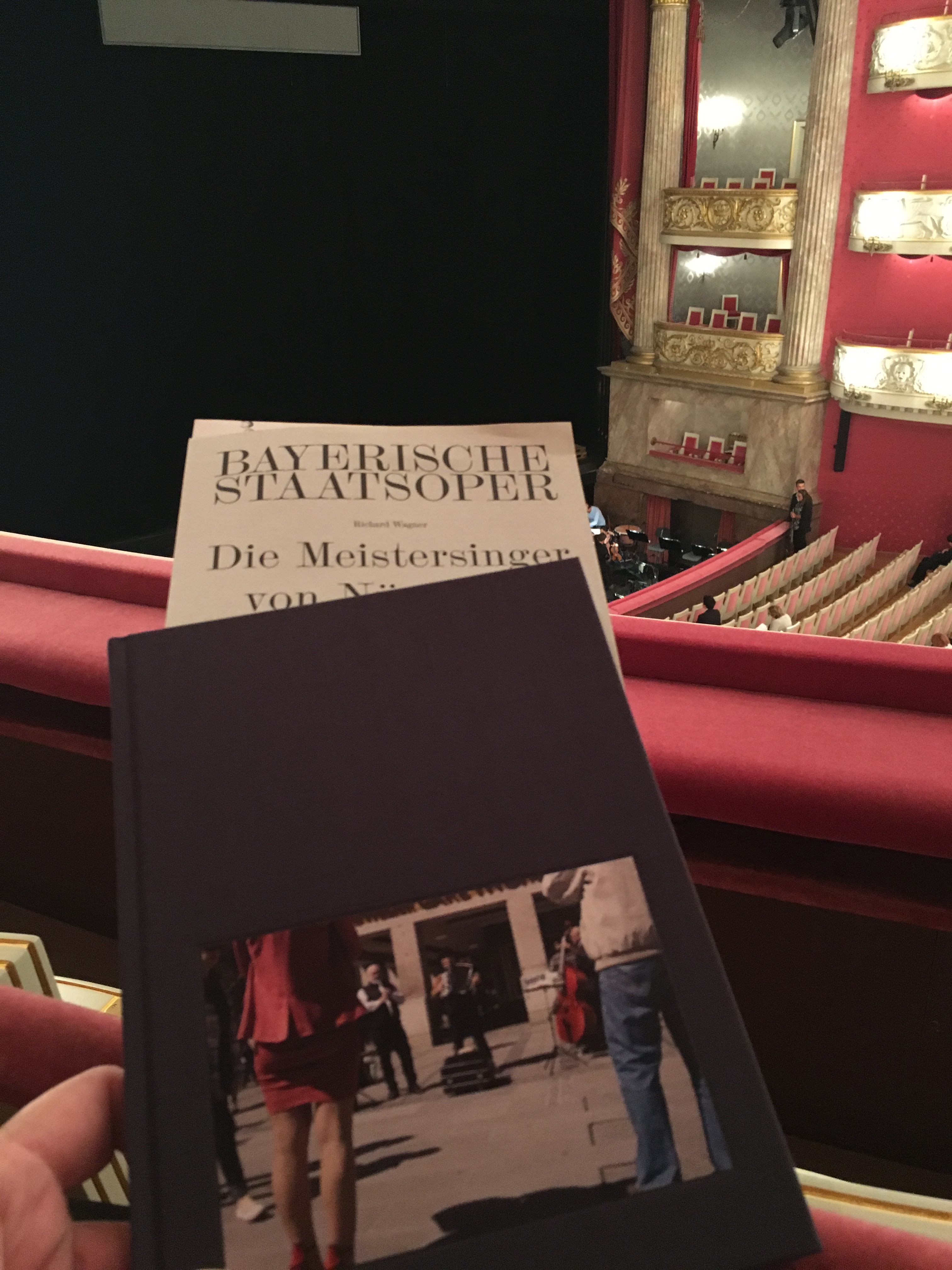 The replacement provided by Bayerisches Staatsoper was announced twice – the first candidate got indisposed as well, which made opera twittersphere to joke about plague in Munich affecting tenors only. Nevertheless, not hyperexcited, arrived for superearly start of performance at 4pm on Monday – since it was a public holiday in Germany. The opera is relatively long, total of 5 hours and 30 minutes with two intermissions, and there are no overtitles in English, so it is a bit of a challenge for non-German speaker. Even knowing the story at some point you might get lost as some words read from the projection board could trigger inner questioning if you are still in line with the story.