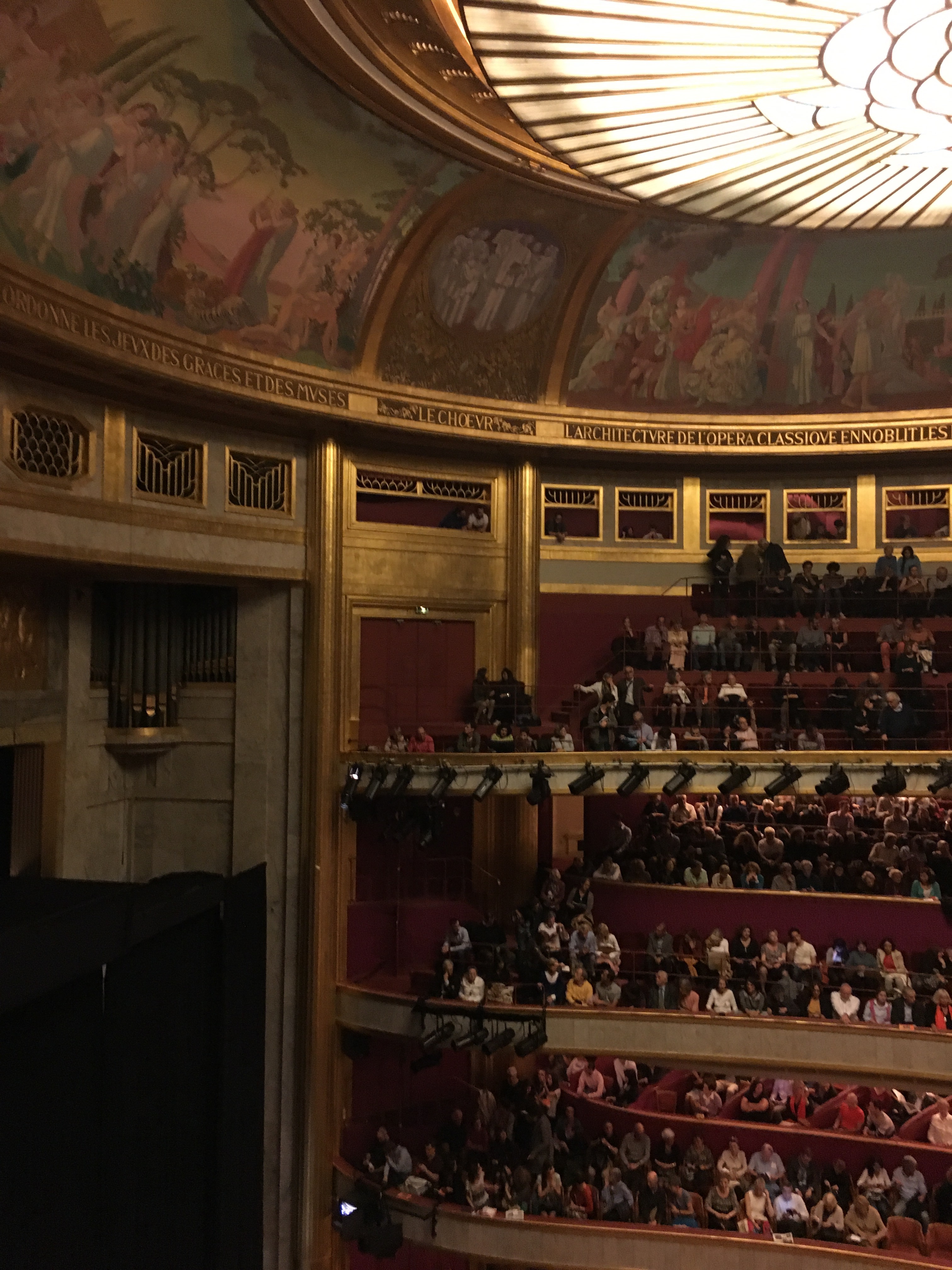 Arriving in Paris early Saturday morning, I have not yet decided what to do, so after arrival by RoissyBus to Opera and gulping down coffee, I checked Theatre des Champs-Elysees website to find out that there might be 15eur tickets sold by the box office for Sunday performance, and went to check it and as there were two available tickets in inexpensive price category I got my backup plan arranged. With the ticket in my possession, sitting at Cafe Francis with a view to Eifel tower and sipping wine, I made the decision to get into Samson at 14:30 and leave after Act2 to rush to TCE.