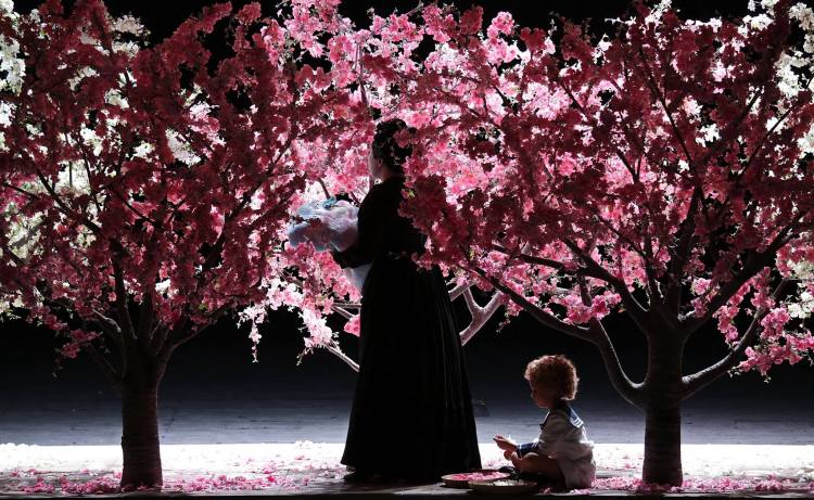 One of the main contributors to the success was also the team led by latvian director and designer Alvis Hermanis supported by reliable peers on sets and costumes, as well as choreography. Over the years of being involved with opera direction Hermanis has developed his signature style, mostly based on striking visuals, thus forcing the audience to absorb and complement proposed pictures. The effect is achieved by masterful usage of videoprojections and filigree hand paintings by Kristīne Jurjāne, who usually extends her reach also into wardrobes. Her signature style is based on scrupulous research and precision in details, for Madame Butterfly detailed studies of period drawings and paintings were carried out, and even minor props for extras and chorus like the fans in off-white / light ivory were procured in Japan to ensure authenticity. It has been said that success lies in details, and visual impression of the production strongly supports the statement.