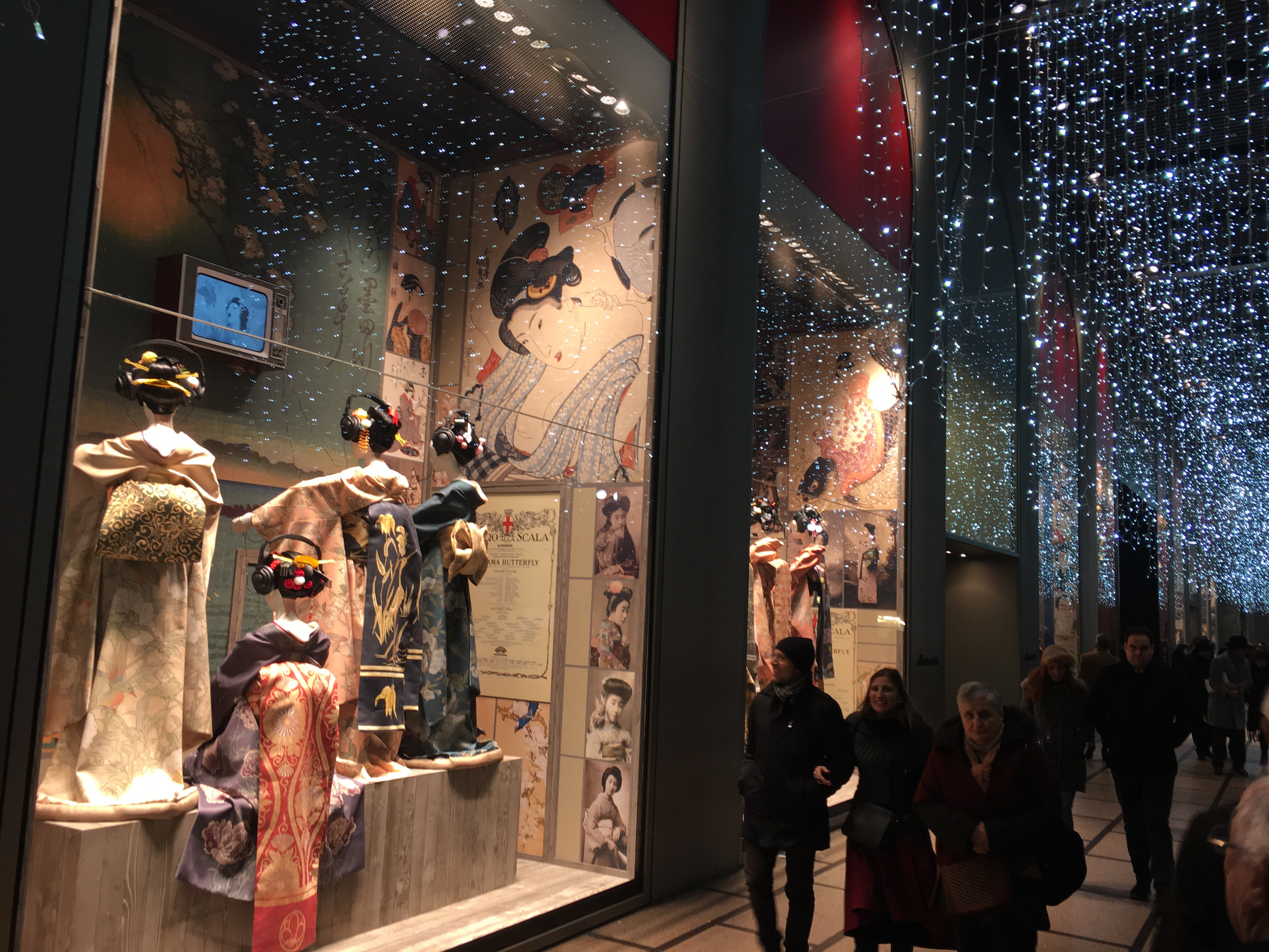 As a part of publicity campaign Alvis Hermanis, Kristīne Jurjāne and Leila Fteita were invited to design the upmarket iconic department store La Rinascente windows as a teaser. The snapshot of still works produced by the team are here for your admiration: all front windows are occupied by traditionally early 20th century japanese style dressed, coiffed and made- up lady mannequins with headphones stuck on their heads in full absorption watching demonstration on the black and white old fashioned TV sets of the perfect way to escape dishonorement: properly slashed jugular vein will guarantee that your name will be cleared of further embarrassment of your family and relatives. The idea works perfectly and convincingly; people are watching and admiring the installations, many are photographing and making selfies. There must be just some accidental people who are unaware of the season opening hit at La Scala. This is also one of the hottest toopics for discussion among milanese: the prima was live streamed on the main TV channel, and almost everyone I met and had a chat with, had seen it and formed their opinion. All were impressed and the verdict sounded briefly: strikingly beautiful.