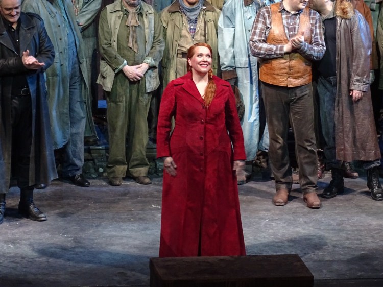 Emily Magee sounded a bit coarse in the beginning, especially in those scenes filled with lower register chest voice required. She adapted later for act 2 and 3, especially her transformation from bar owner into romantic lady and passionate lover was well acted and sung. Her “Oh se sapeste” was delicate and delightful, and final aria saving her beloved Dick was filled with energy and passion.