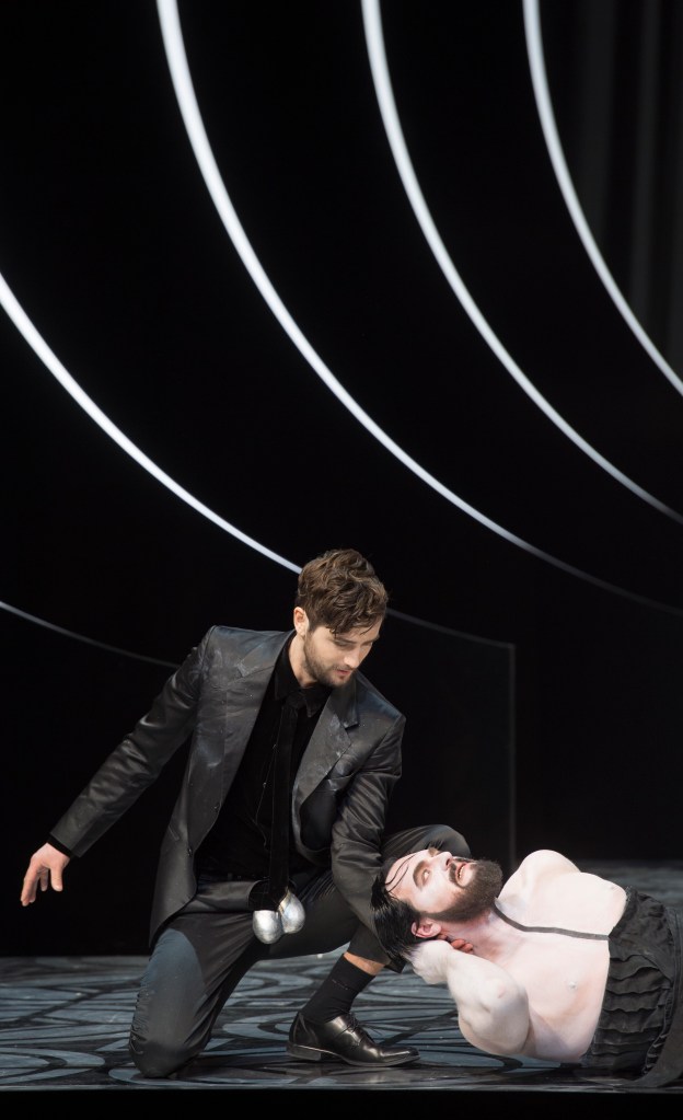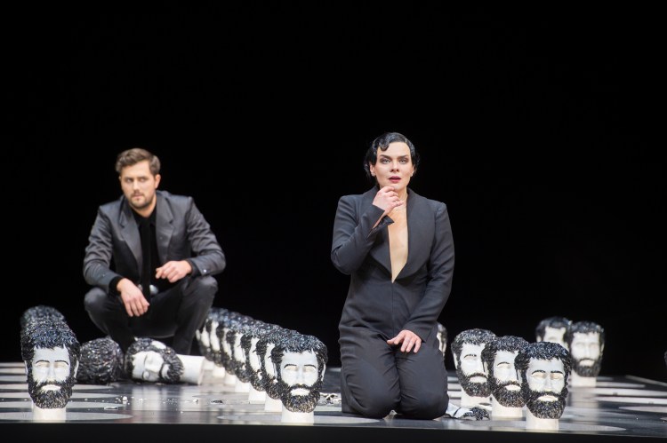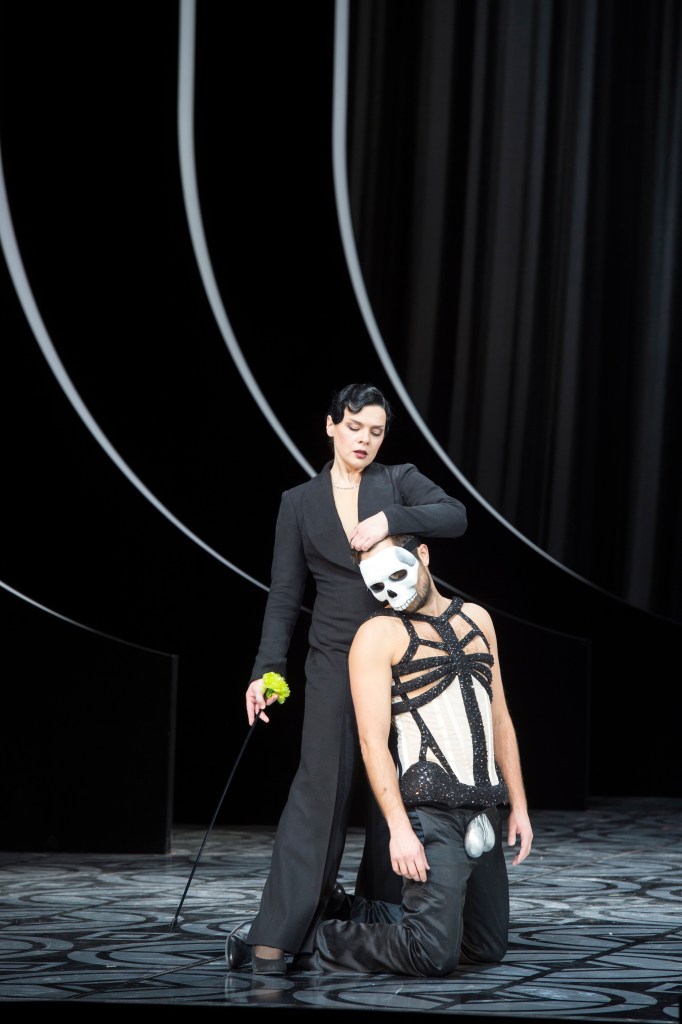 The second night was intriguing mostly due to Neuenfels, his frequently radical approach both to aesthetics as well as libretto promised surprises. This time the staging did not go far from his team’s typical signatory of black and white dominance with an accent of occasional red. The stage is timeless, symbolic phallic rocket serves as prison for Jochanaan, and the most innovative element is appearance of Oscar Wilde as a silent participant – or even puppet master of the night equipped with eye-catching silver testicles. Princess Salome is transformed from oriental princess into alter ego of Wilde, liberating her from stereotypes and providing with unlimited freedom to explore and express her sexuality. Wilde is the only one who has balls – literally and symbolically. The leitmotiff of the night is a quote from the libretto: the mystery of love is greater than the mystery of death. Thus The Dance of the Seven Veils transforms into desire supercharged game with the death, and 42 heads of anonymous Jochanaans at the final scene epitomise also fragility of love (shatted into shards, then pick it up and tell how strong your love is) and unavoidableness of death – end of physical presence of the body.