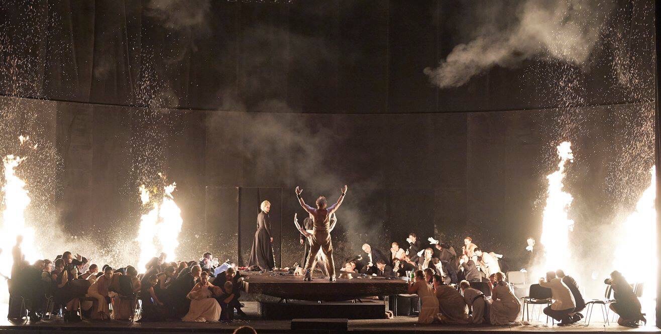 The production is staged by Alexandra Liedtke and her take of the myth is based on Saint-Saëns approach to limit biblical content in the opera thus focusing on the inner drama and interpersonal difficulties. The backdrop of the story is still rooted in the historical context: the war between Israelites and Philistines is ruthless, the power has to be continuously reconfirmed. Samson is the one chosen to serve the higher purpose, and he unquestionably leads his people to the future. Dalila is chosen as well, but not by God but its servant, the high priest and her strength lies in understanding and influencing people. They both are driven by faith, but their beliefs are very different. They both are extremely strong and – unbelievably lonely in their paths. The suffering torments, but love can destroy a trustful heart. The drama of love, hate and betrayal is on the stage here – minimalistic set designed by Raimund Orfeo Voigt with some noisily moving rotating room in Act 2, revealing a bathtub filled with water to be angrily splashed around, sudden disturbing rain-shower floods from the ceiling, and finale with a fashion runway which serves as a stage for tearing apart defeated Samson or his dancing “body-double” and frightening fireshow for the grand-finale.
